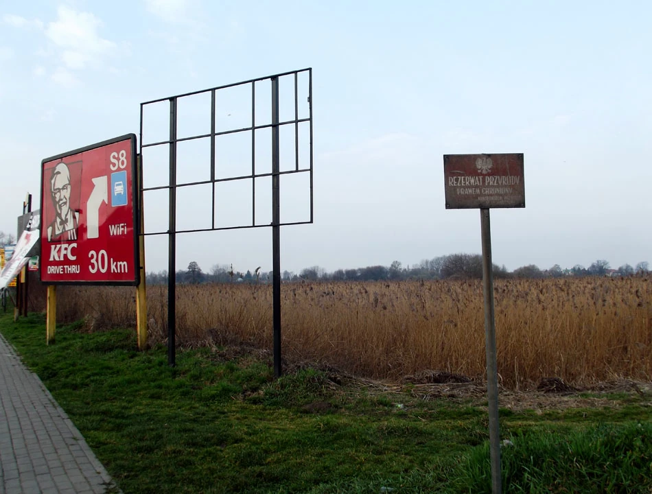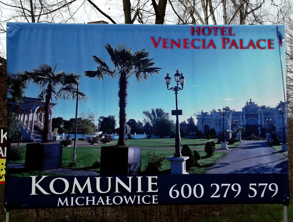 Zachęceni reklamą Hotelu Venecia Palace zmieniamy plany i zamiast do Falent jedziemy do Michałowic. To już drugi raz z rzędu, gdy kusi nas to włoskie miasto. Mijamy Staw Puchalski i oddalamy się od Alei Krakowskiej. Tu, w nieoczywistym sąsiedztwie, występują rezerwat przyrody i wszechobecne reklamy.