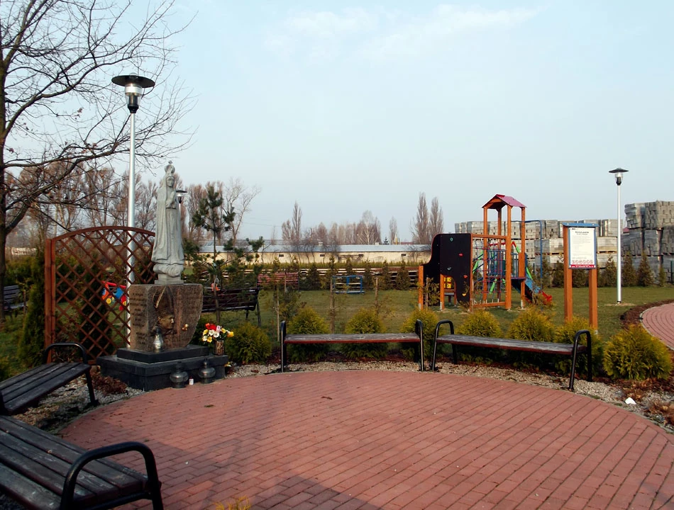 Ulicą — a jakże — Centralną, jedziemy w stronę Puchał. Okolica raczej nie zwiastuje obecności weneckiego pałacu. Raczej tu brzydko. Blisko jednej z okolicznych hurtowni, spotykamy kameralny plac zabaw połączony z maryjną kapliczką. Widok z lekka surrealistyczny.