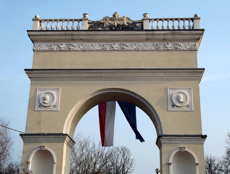 Wjeżdżamy przez łuk triumfalny zdobiony główkami z inicjałami; spekulujemy, że to może podobizny właścicieli.