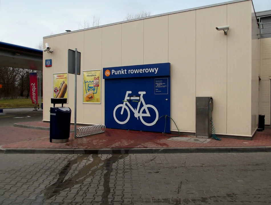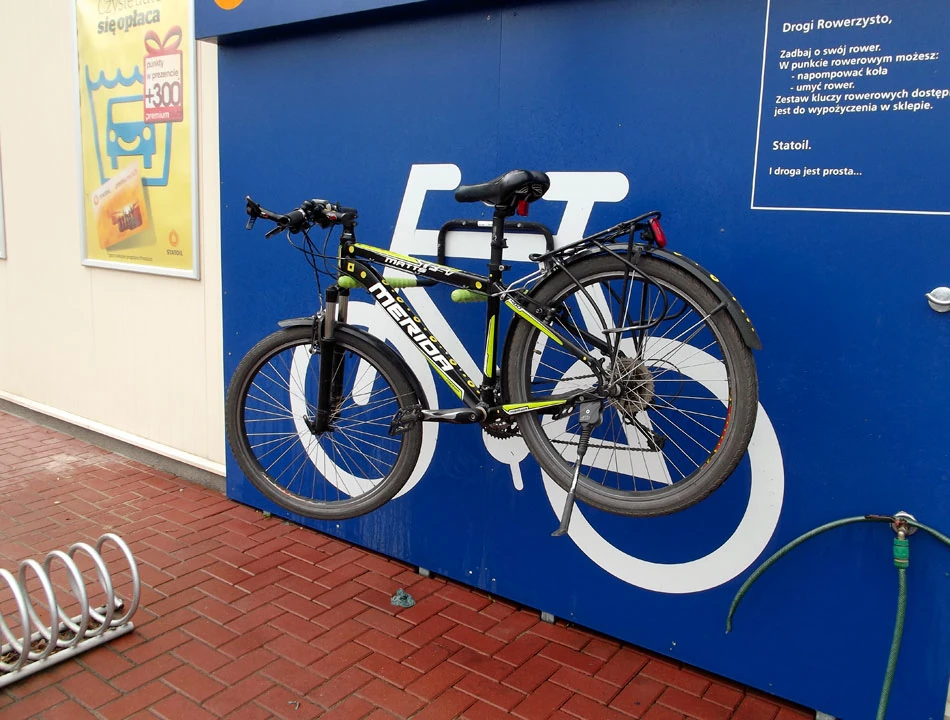 Znowu lądujemy na Nowoursynowskiej, która stała się nagle kilkupasmową, przelotową ulicą. Naszą uwagę zwraca punkt rowerowy na stacji benzynowej. Zatrzymujemy się, bo stacje paliw to często nasi kawowi sprzymierzeńcy. Punkt obiecuje możliwość umycia roweru, napompowania kół i dostęp do kluczy na stacji. Z tych obietnic nie pozostaje wiele. Szlauch nie ma końcówki, kompresor ma zepsutą końcówkę, o klucze już nie pytamy.