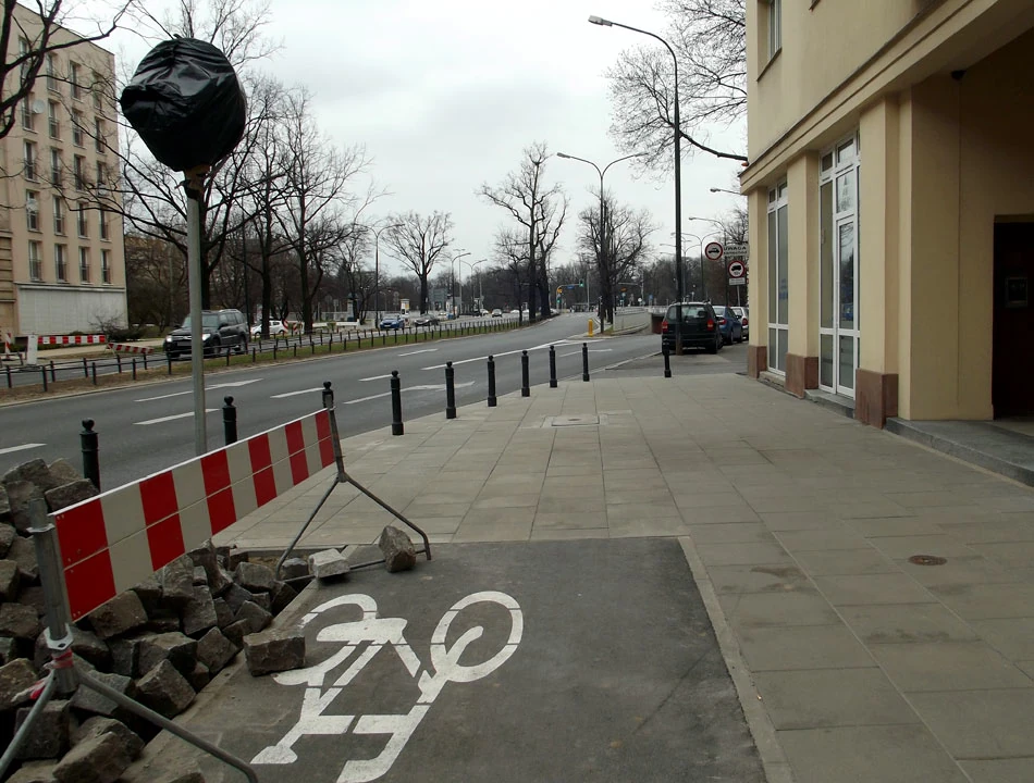 Od pl. Unii jedziemy nową drogą dla rowerów wzdłuż Szucha. Droga zaczyna się dość dziwnie i dość nieoczekiwanie kończy; początek i koniec nie są skomunikowane z niczym.