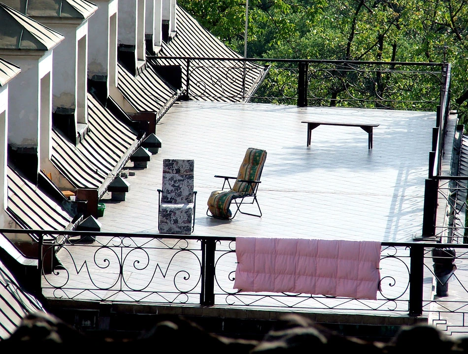 W dole widać ogrody klasztoru Sióstr Miłosierdzia św. Wincentego a Paulo. Siostry mają piękny zielony teren wykorzystywany nie tylko pod uprawę warzyw. Sądząc po leżakach na tarasie, mają też świetną miejscówkę na relaks.