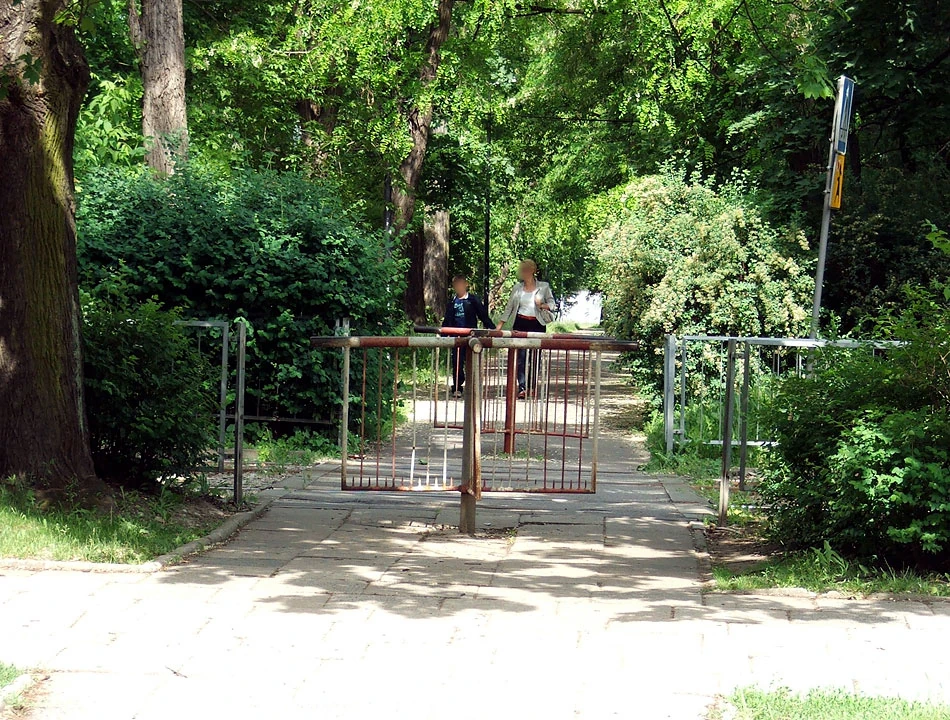 Zakroczymską i przez Park Traugutta dojeżdżamy do Międzyparkowej. Zaraz za torami tramwajowymi, w pobliżu schroniska młodzieżowego, są niemal zabytkowe kołowrotki spowalniające ruch.