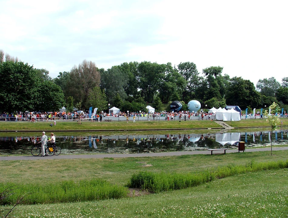 Wzdłuż muru Cytadeli dojeżdżamy do Kaniowskiej i trochę się kręcimy po uliczkach Starego Żoliborza. Czarnieckiego przecinamy Krasińskiego i Promyka dojeżdżamy do Gwiaździstej. Na Kępie Potockiej odbywa się maraton sztafet, tłumy ludzi biegają wkoło kanałku.