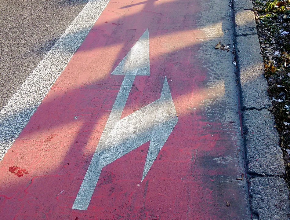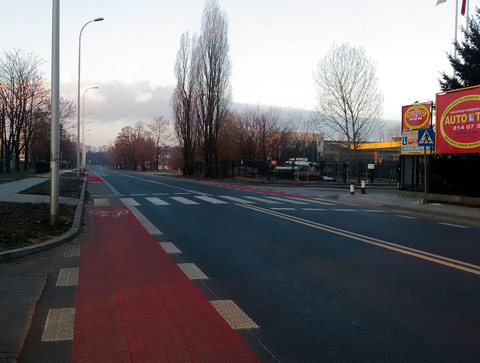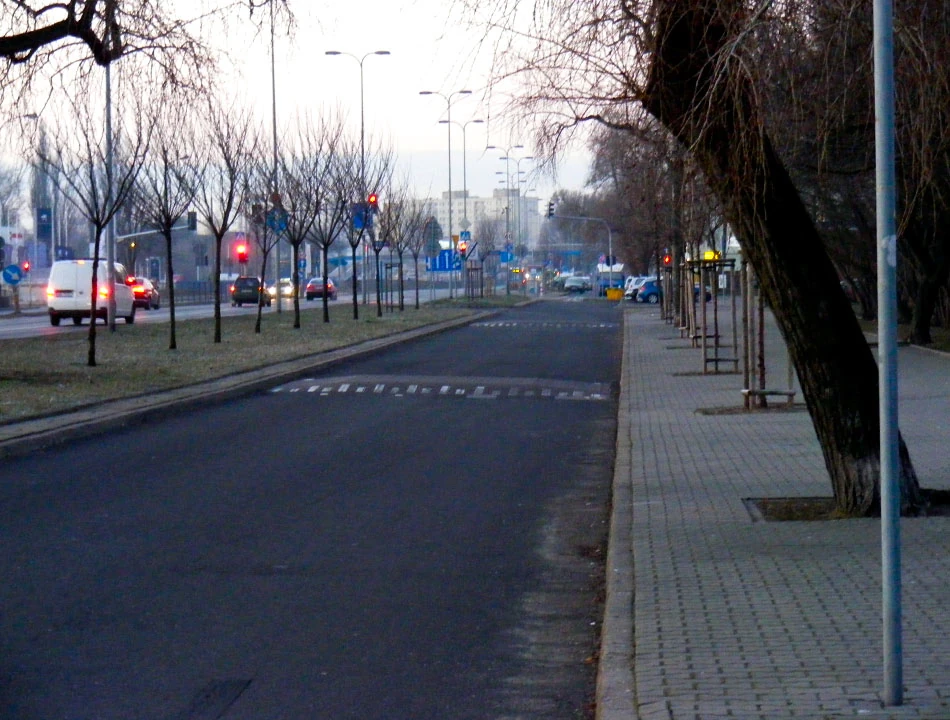 Pas rowerowy elegancko wyprowadza nas na Wólczyńską. A Wólczyńska, meandrując obok huty, doprowadza nas do ulicy Conrada. Chcemy dojechać do Wrocławskiej i zobaczyć pasy rowerowe między Powstańców Śląskich i Radiową. Jedziemy Wrocławską, śnieg zaczyna sypać prosto w twarz i zima robi się coraz mniej przyjemna. Nareszcie jest jakiś pas, ale nawet nie chce się nam przyjrzeć mu z bliska, bo zamierzamy odbić w stronę Woli.