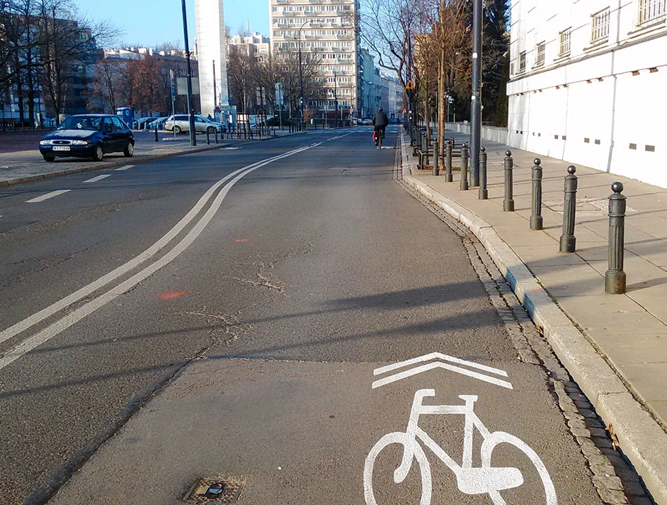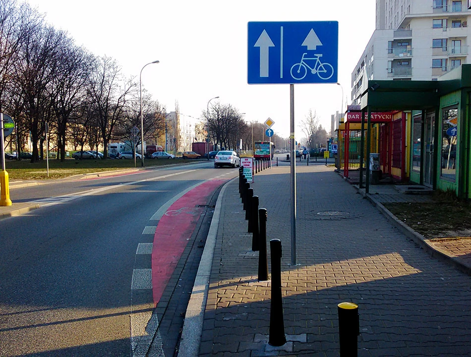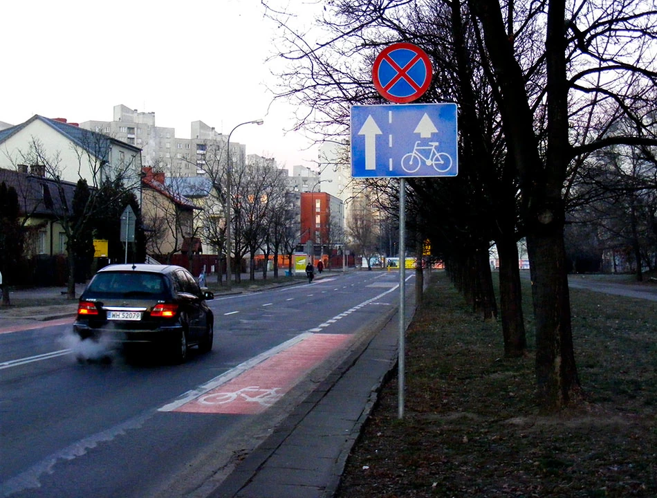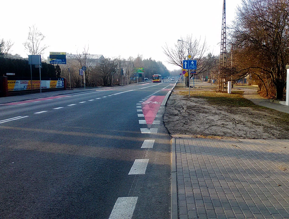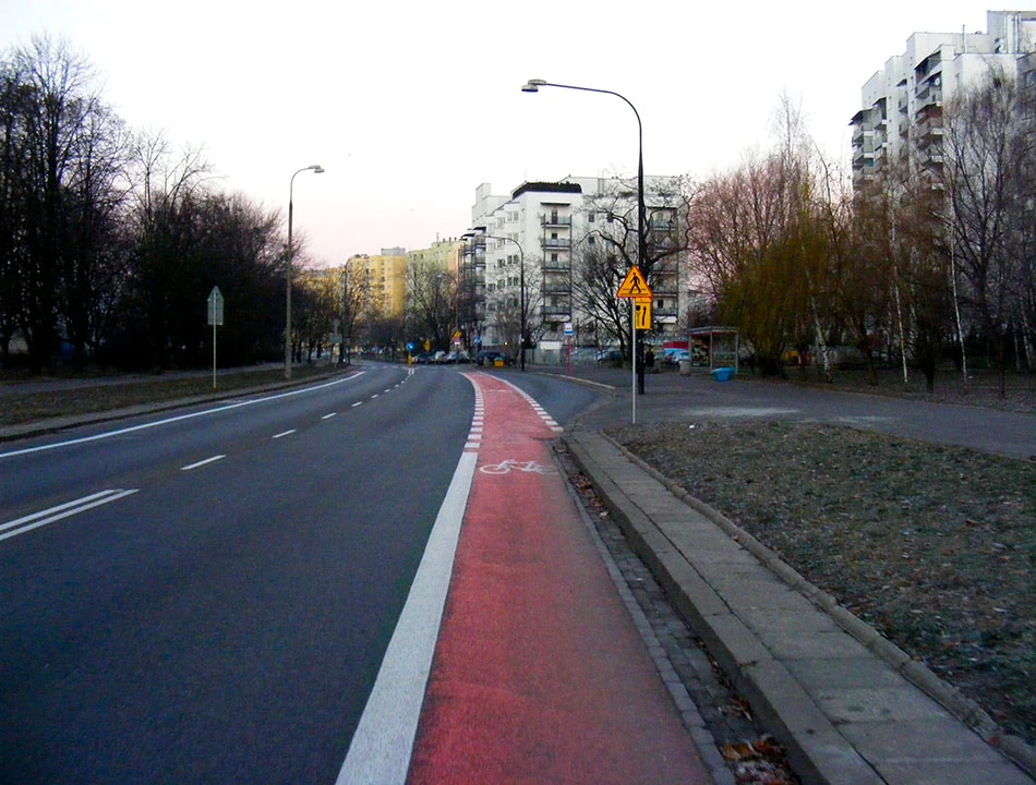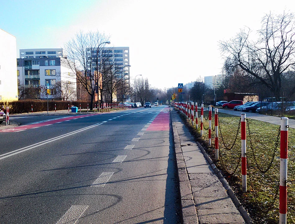 Wjeżdżamy w Wóycickiego. Tu, przy okazji frezowania nawierzchni, powstał trzykilometrowy pas rowerowy, podobno najdłuższy w Warszawie. Pas z definicji jest rzeczą w pasie drogi. To lubimy najbardziej, bo nie zabiera przestrzeni chodnika i uspokaja ruch samochodowy na jezdni.