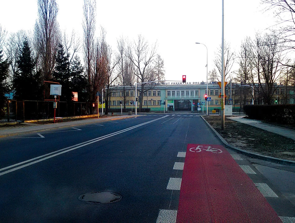 Rembielińską przecinamy Trasę AK i Annopolem dojeżdżamy do Odlewniczej. Tu jest jeden z trzech WORD-ów w Warszawie, gdzie adepci sztuki prowadzenia samochodu zdają egzaminy na prawo jazdy. Tu także wymalowano pas rowerowy. Trochę nie wiemy po co, ulica jest mała i wygląda na spokojną, chyba że chodzi o zwrócenie uwagi przyszłym kierowcom na prawa osób poruszających się na rowerach.