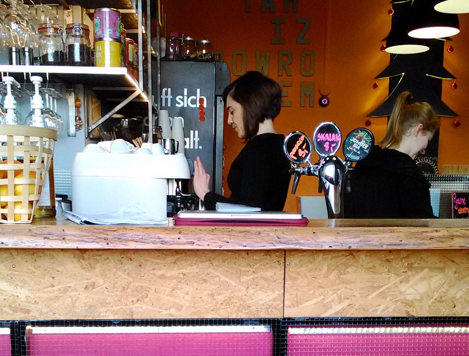 Znowu minęła chwila i potrzebujemy uzupełnić płyny i ogrzać ciała. Wchodzimy do sympatycznej klubokawiarni Tam i z powrotem. Kawa i jedzonko całkiem, całkiem.