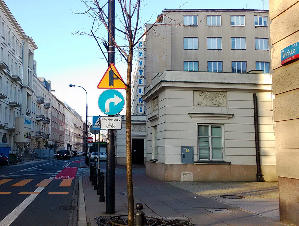 Powoli zmierzamy w stronę domu. Jeszcze przez Pole Mokotowskiej jedziemy do Koszykowej, bo tam też pojawiły się pasy rowerowe, na odcinku Lindleya – Chałubińskiego wymalowano elegancką drogę. Potem przeskok przez Plac Konstytucji i z Pięknej skręcamy w Wiejską – tu poprowadzono praktyczny kontrapas.
