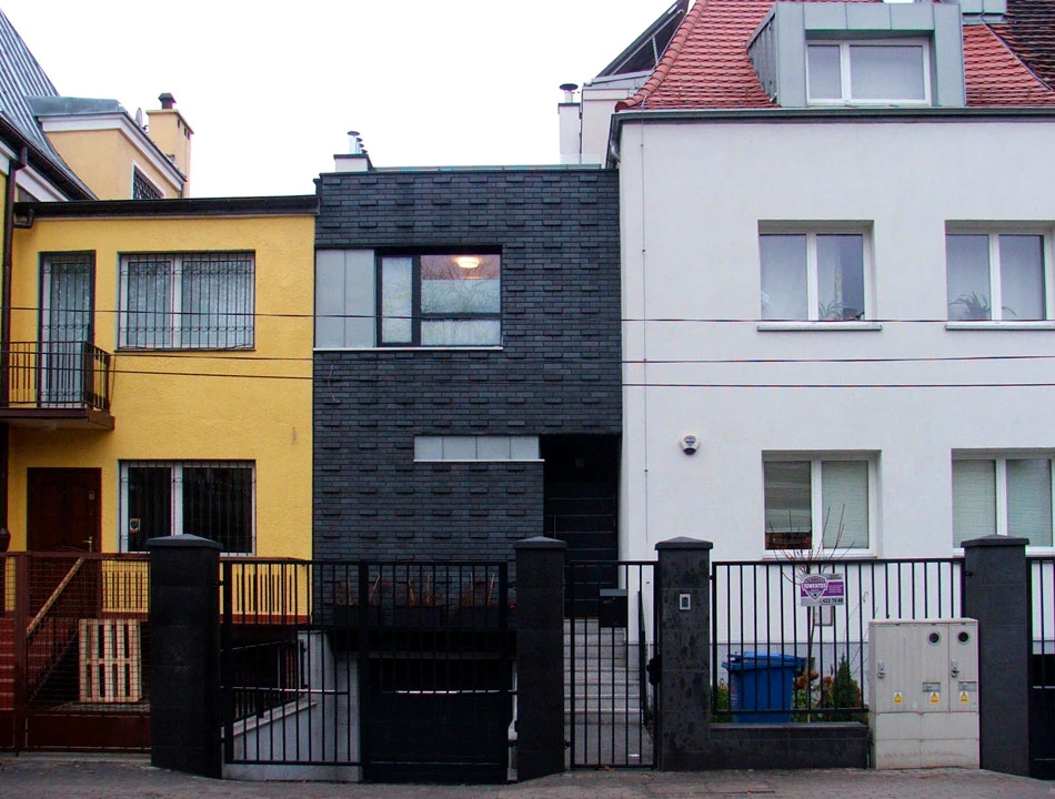 Kręcimy się wokół fortu po okolicznych uliczkach i na Miłobędzkiej wpada nam w oko ciekawy budynek. „Plomba” jest wciśnięta między dwa budynki i widzimy tylko jej front. Budynek ma zwartą formę, minimalistyczną wręcz. Wystające cegły trochę nawiązują do pobliskiego fortu. Całość jest oszczędna, jednak bardzo przyciąga wzrok. Ciekawe, jak zaprojektowano ten budynek wewnątrz?