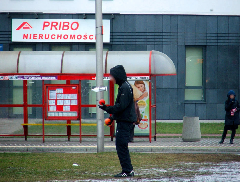 Zostawiamy fort za sobą i wjeżdżamy w Aleje Jerozolimskie. Na rogu z Prymasa Tysiąclecia jakiś zakapturzony młody człowiek trenuje żonglerkę. Nie wiemy, czy dla sportu, czy dla pieniędzy.