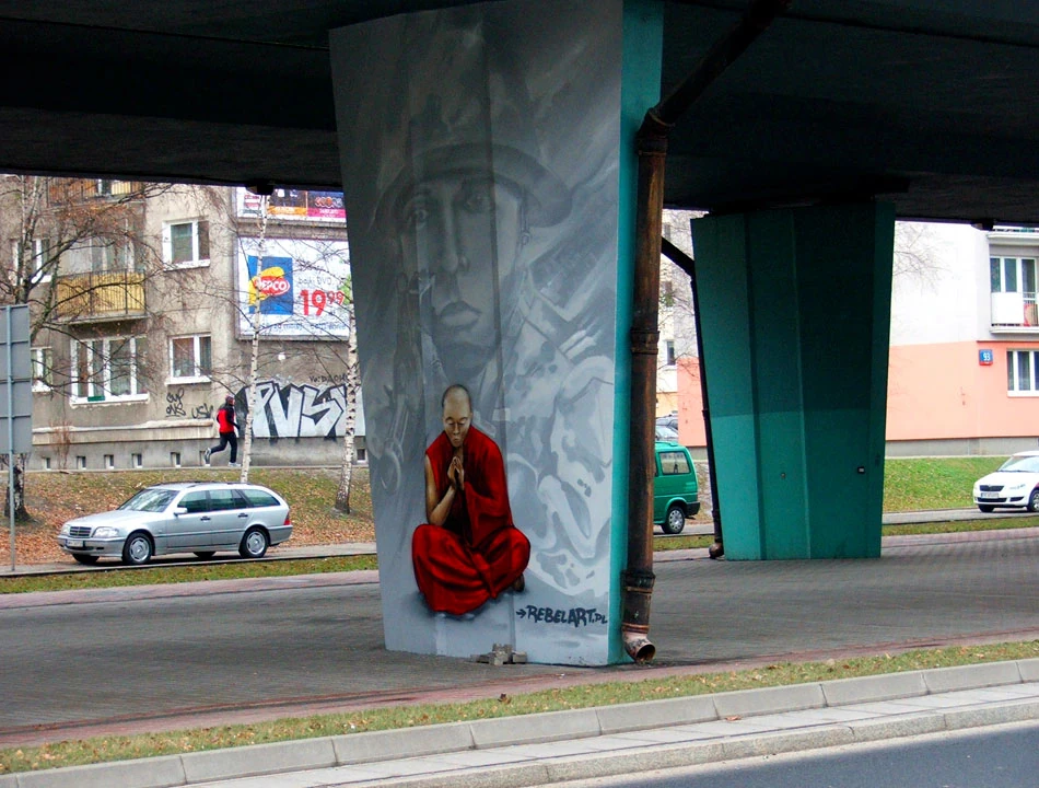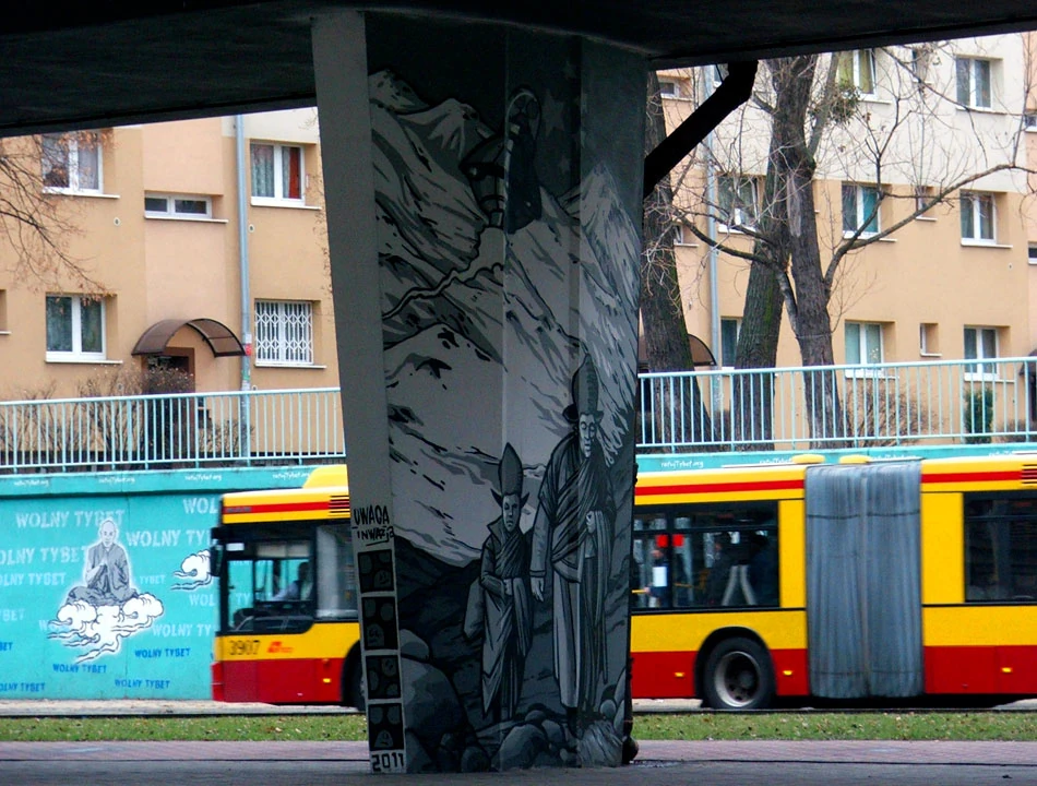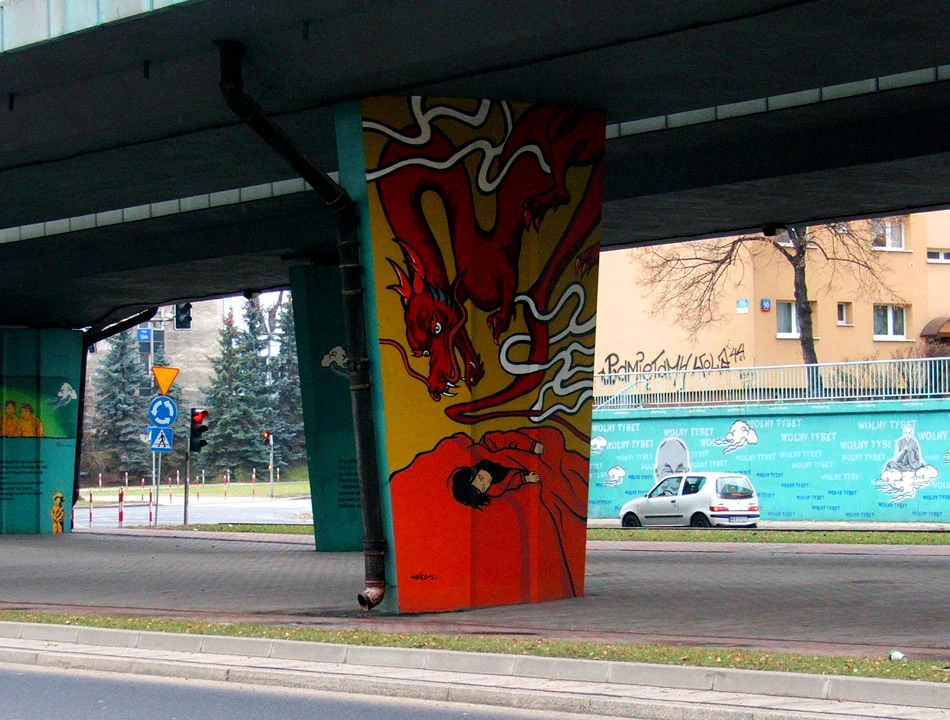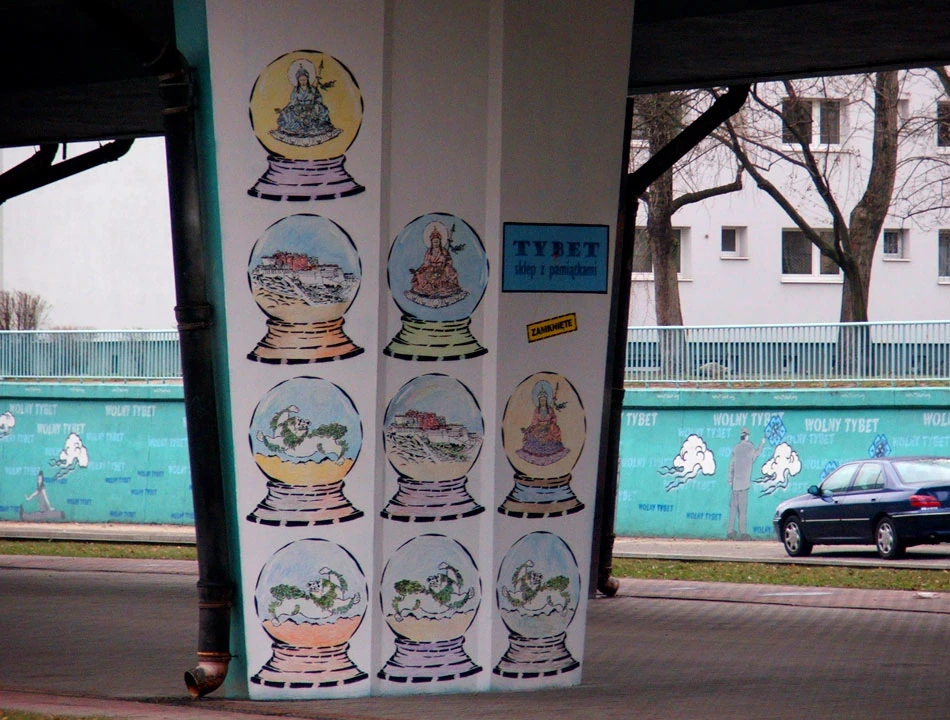 Drogą dla rowerów jedziemy wzdłuż Prymasa w stronę Powązek. Między Kasprzaka a Wolską, zaraz za Rondem (Wolnego) Tybetu, napotykamy galerię sztuki na świeżym powietrzu. Na podporach estakady jest mnóstwo malowideł związanych z walką o wolny Tybet. Niektóre murale są zaskakująco dobre, inne tylko poprawne.