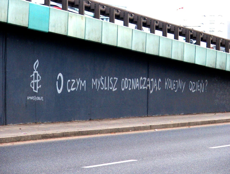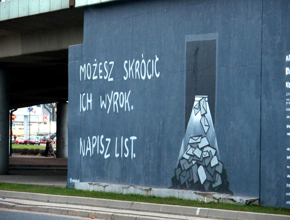 Przy skrzyżowaniu z Górczewską kolejna galeria, tym razem to ściana dedykowana akcjom Amnesty International. Graffiti zachęcają do wzięcia udziału w akcji pisania listów w obronie ludzi uwięzionych: od działacza białoruskiej opozycji, poprzez więźnia w Guantanamo, aż po członkinie kapeli Pussy Riot. Wola wyraźnie ma szczęście do sztuki tworzonej z przesłaniem społecznym. Ma na swoim terenie swoistą galerię wolności.