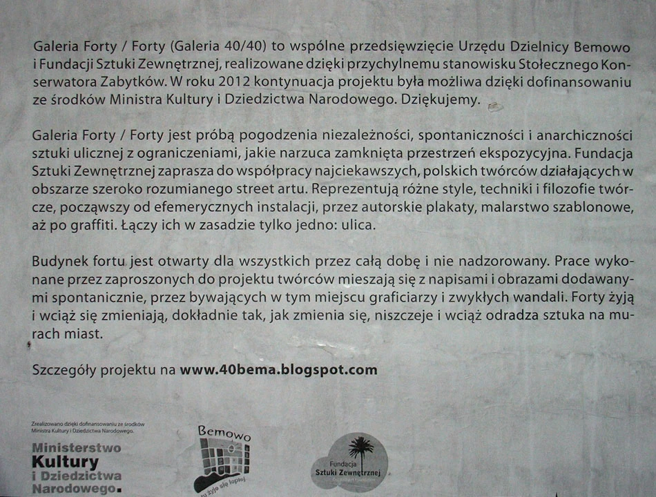 W jednym z fortów odkrywamy wspaniałą galerię sztuki. To projekt 40/40, wspólne przedsięwzięcie Urzędu Dzielnicy Bemowo i Fundacji Sztuki Zewnętrznej, realizowane dzięki przychylności Stołecznego Konserwatora Zabytków.