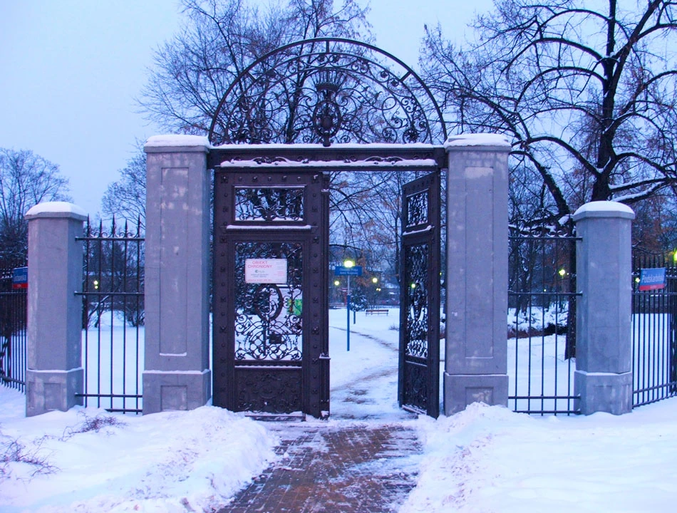 Nasypało śniegu, zawiało. Tak więc do parku. Ale nie na sanki, tylko na rower. Zaczynamy, a jakże, od naszego domowego parku, czyli Parku Obwodu Praga AK. Nazwę ma przydługą jak zresztą wiele warszawskich zieleńców. Za to ładny jest i zadbany. Kiedyś był tu targ koński, teraz są dwa place zabaw, boisko, fontanna, zadbane alejki. Mimo panującego jeszcze zmroku brama jest otwarta i można wejść.