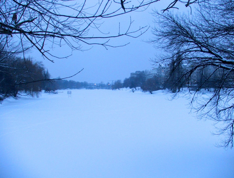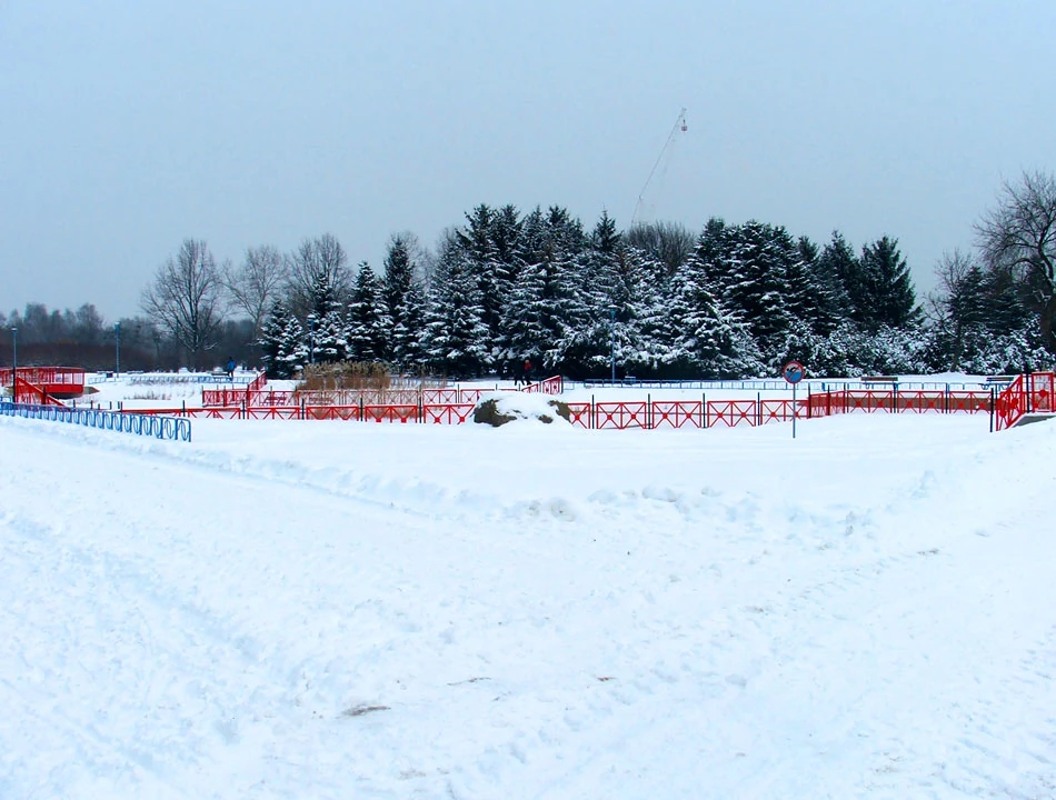 Przecinamy Międzynarodową, mijamy Jeziorko Kamionkowskie i wjeżdżamy do Skaryszaka; białość naokoło. Park Skaryszewski to jeden z najładniejszych i największych parków Warszawy, jednak o tej porze pusto w nim, amatorów spacerów niewielu. Ktoś truchta dla zdrowia, a poza tym można kontemplować ciszę i biel.