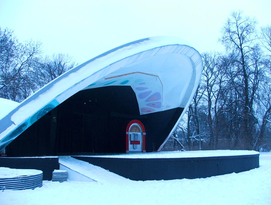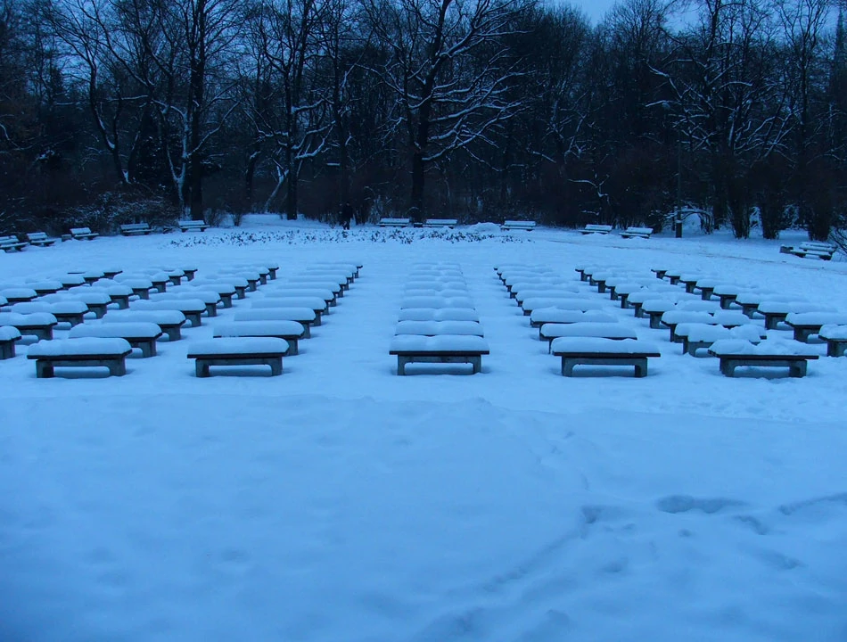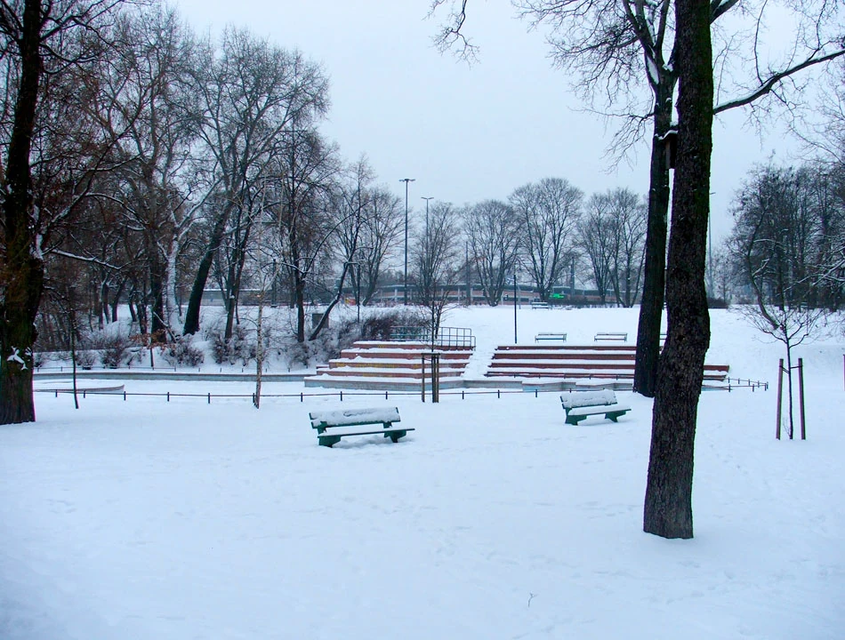 Jedziemy Wybrzeżem Szczecińskim, mijamy Port Praski i docieramy do Parku Praskiego, najstarszego publicznego parku w Warszawie. Park powstał na przełomie lat sześćdziesiątych i siedemdziesiątych XIX wieku. Początkowo zajmował 30 ha; w okresie międzywojennym z jego terenu wydzielono warszawskie ZOO. Przed muszlą koncertową, w równych szeregach, zamarły ośnieżone kamienne ławki. Nam skojarzyły się z rzędami mogił w Palmirach.