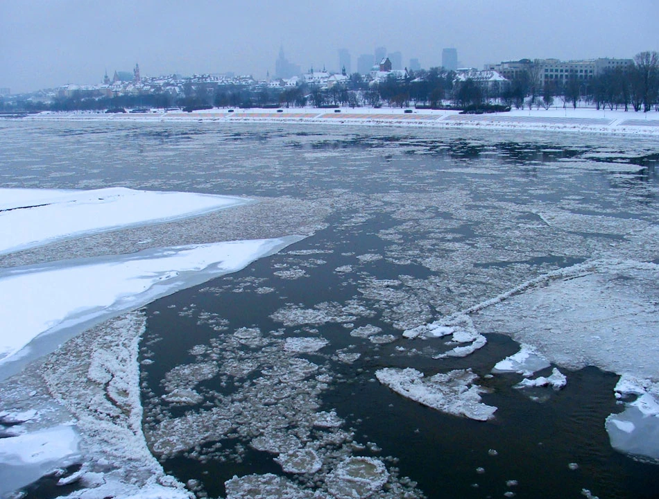 Z Mostu Gdańskiego podziwiamy zimową panoramę Warszawy, a w dole malowniczo i dostojnie przemieszcza się Wisła.