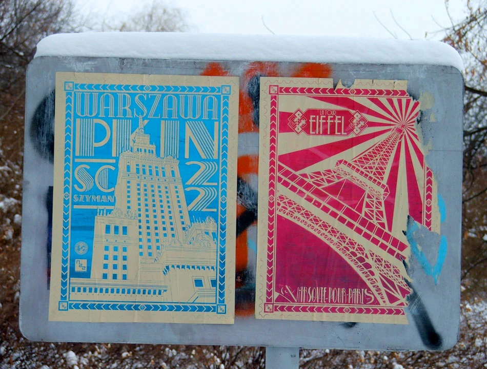 Napotykamy ciekawe wlepy na odwrocie jednego ze znaków, kojarzące się z niektórymi pracami w Fortach Bema.