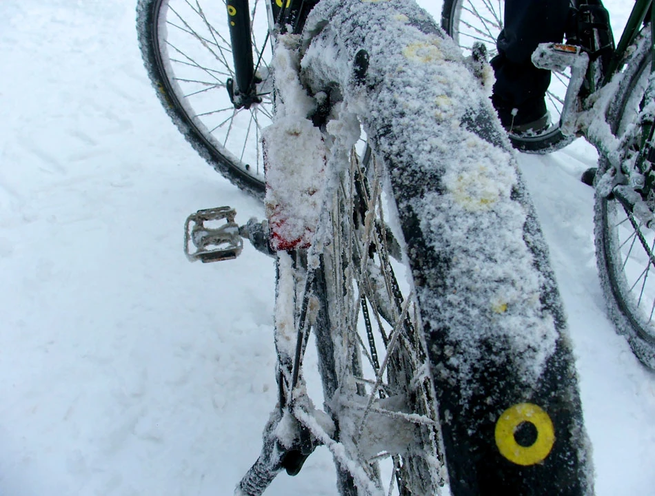 Jednak większość warszawskich parków jest zamknięta dla rowerzystów. Rzadko w ich pobliżu wytyczane są drogi dla rowerów, na ogół wisi po prostu zakaz ruchu bicykli. Dzisiaj momentami jest nam wszystko jedno, bo niejednokrotnie przepychamy rowery przez kopny śnieg. A nasze pojazdy nabierają ochronnych barw.