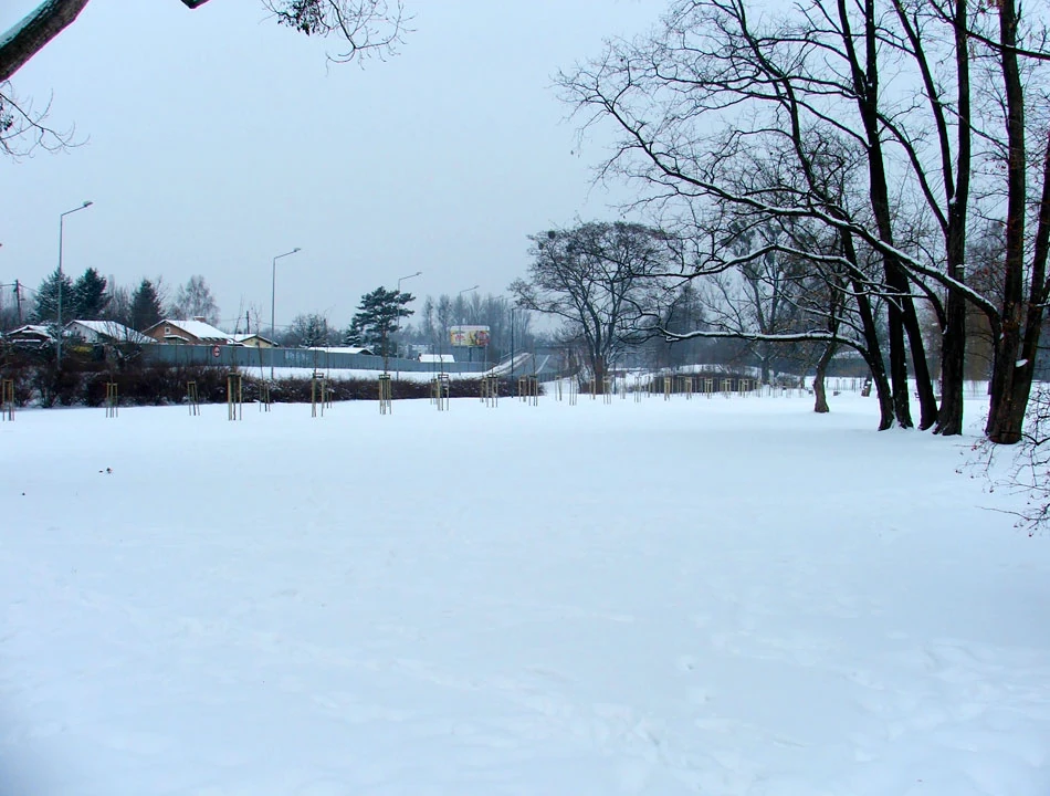 A za chwilę, jak mówią słowa piosenki „...już jestem na drugim jej brzegu”. Przez zaśnieżoną drogę dla rowerów docieramy do Wenedów, przecinamy Zakroczymską i wślizgujemy się w Międzyparkową. Piotrka dopiero teraz olśniło, skąd taka nazwa ulicy. Po jednej stronie ulicy jest Park imienia Romualda Traugutta, po drugiej Szkolny Park Sportowy im. Janusza Kusocińskiego. Tak naprawdę jednak ulica Międzyparkowa wytyczona została przed II wojną na terenach pofortecznych. Parków w ich dzisiejszym kształcie jeszcze nie było.
