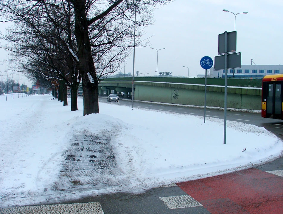 Z dworcowego tunelu wydostajemy się po drugiej stronie Alej Jerozolimskich i zdążamy w kierunku Szczęśliwic. Po drodze nadziewamy się na zwodniczo odśnieżoną drogę dla rowerów.