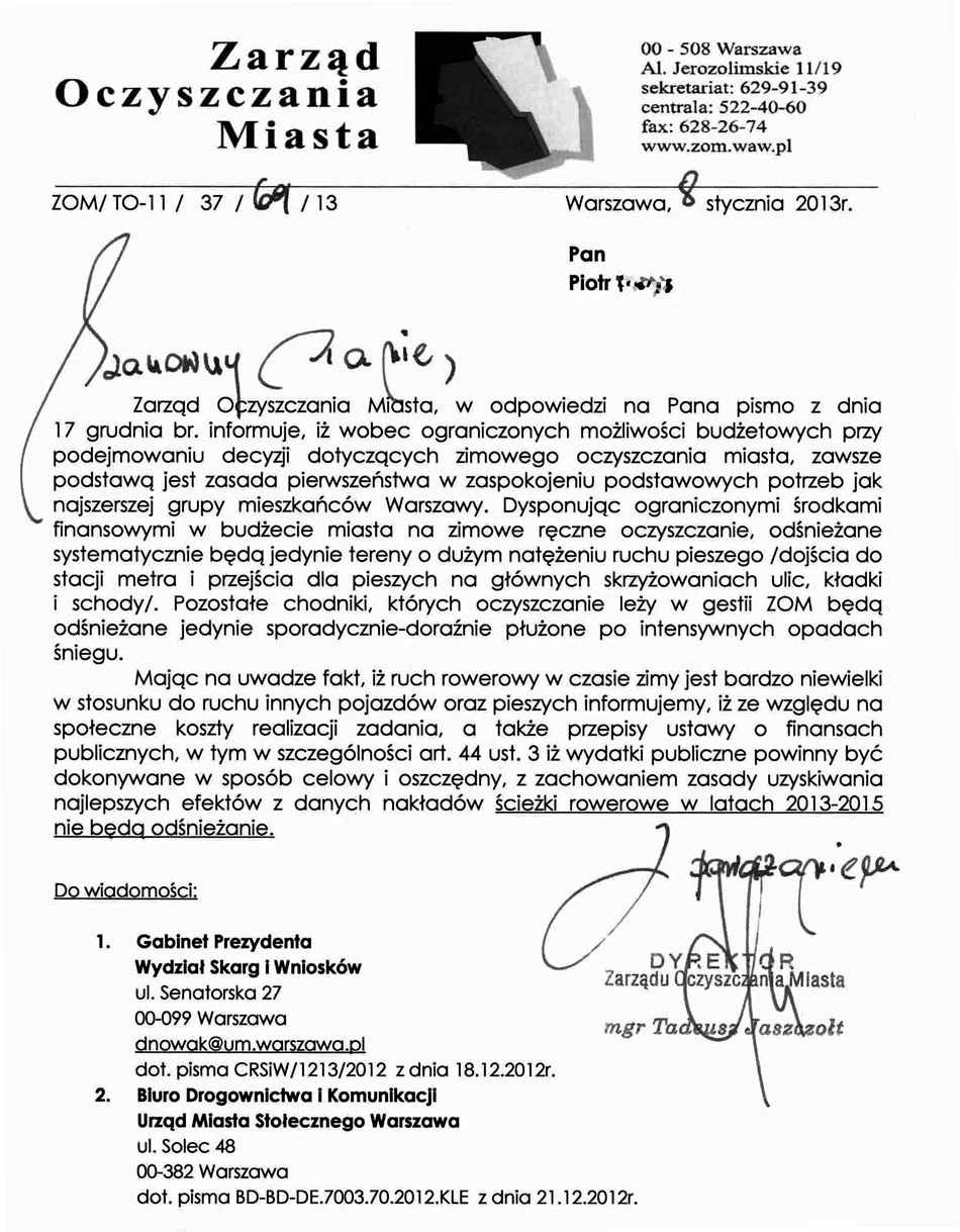 Nasza codzienna jazda na rowerze po Warszawie pokazuje, jak mało ważna dla decydentów jest kwestia przejezdności dróg dla rowerów. Piotrek napisał list do miasta w tej sprawie. I otrzymał odpowiedź od Tadeusza Jaszczołta, dyrektora Zarządu Oczyszczania Miasta. Wynika z niej, że drogi dla rowerów w Warszawie w latach 2013-2015 nie będą odśnieżane.
