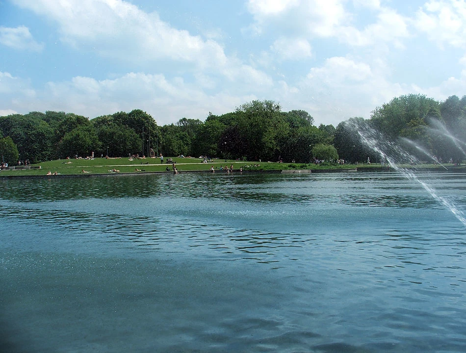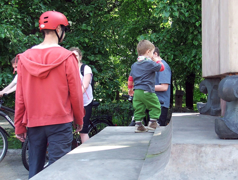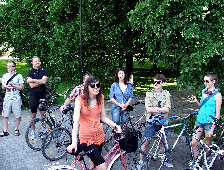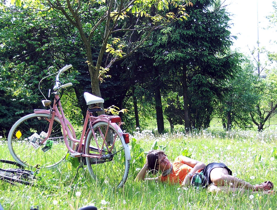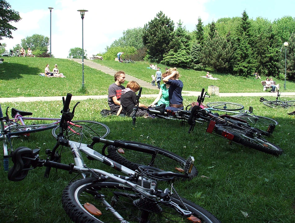 Przez pl. Unii Lubelskiej i Batorego wjeżdżamy na Pola Mokotowskie. Kładką nad alejami Niepodległości (część jedzie prosto Batorego) dojeżdżamy nad staw na Polach. A tu warszawiacy odpoczywają, leniuchują, piją browar i wyprowadzają psy – regularna miejska majówka. Na Polach my też się zatrzymujemy i odpoczywamy.